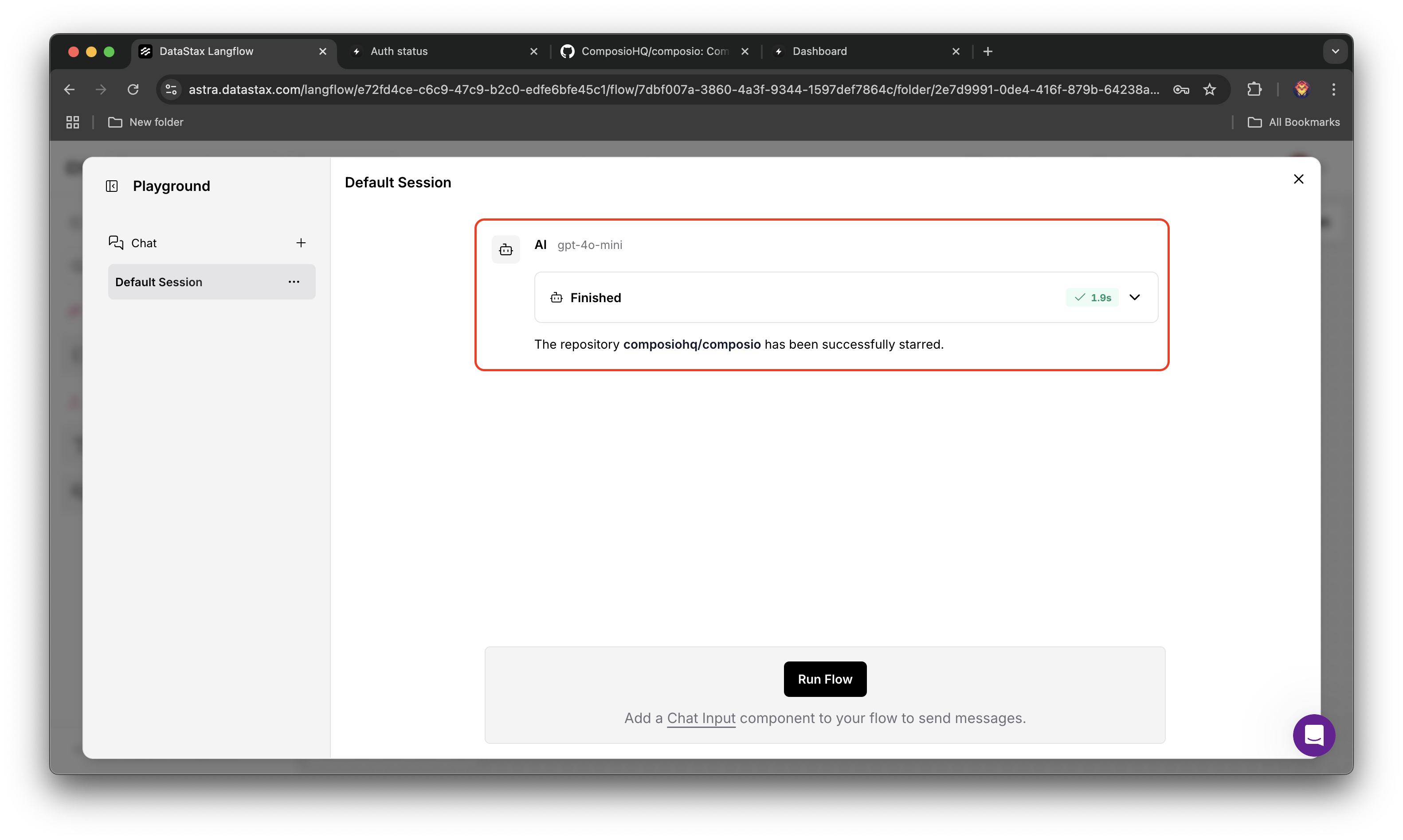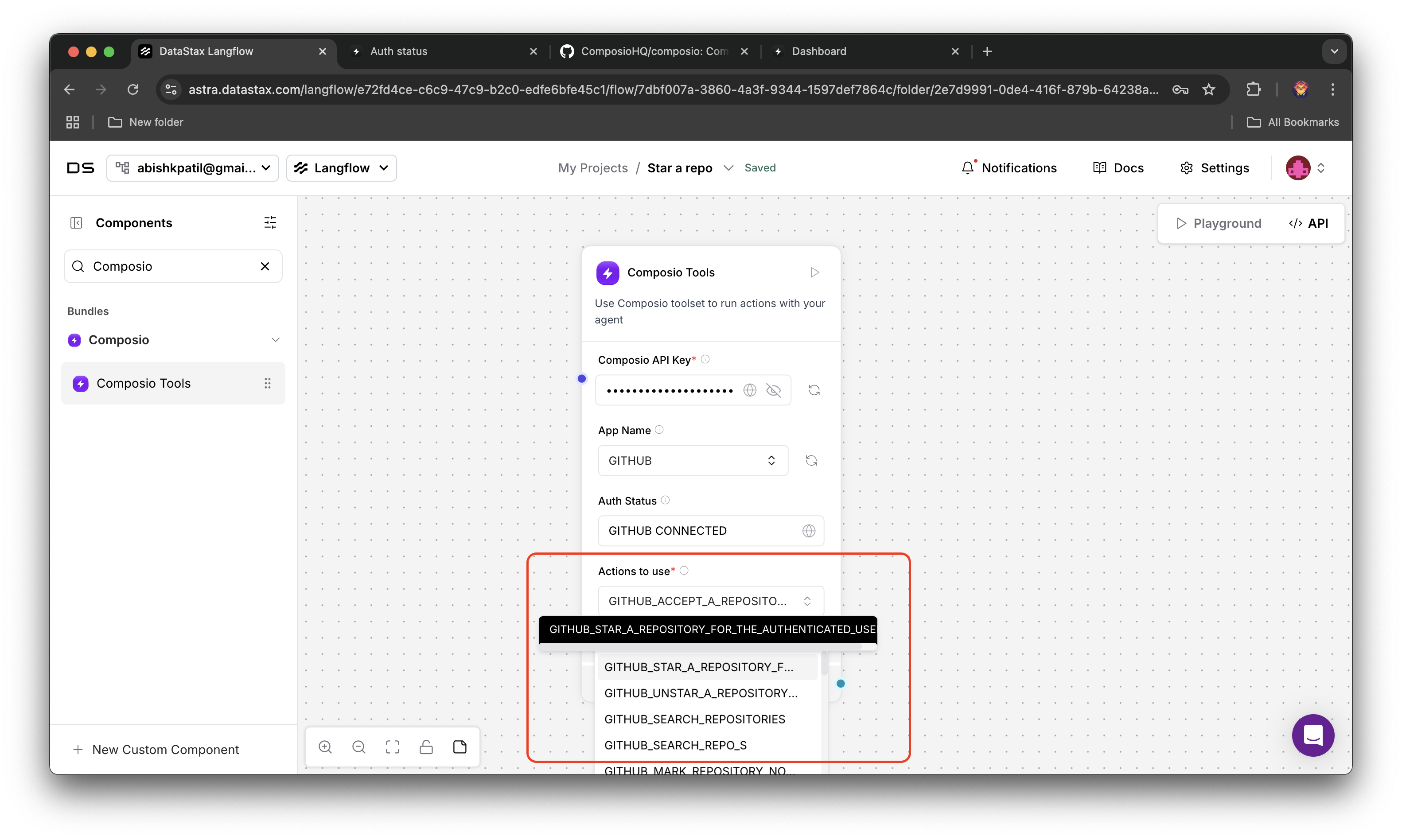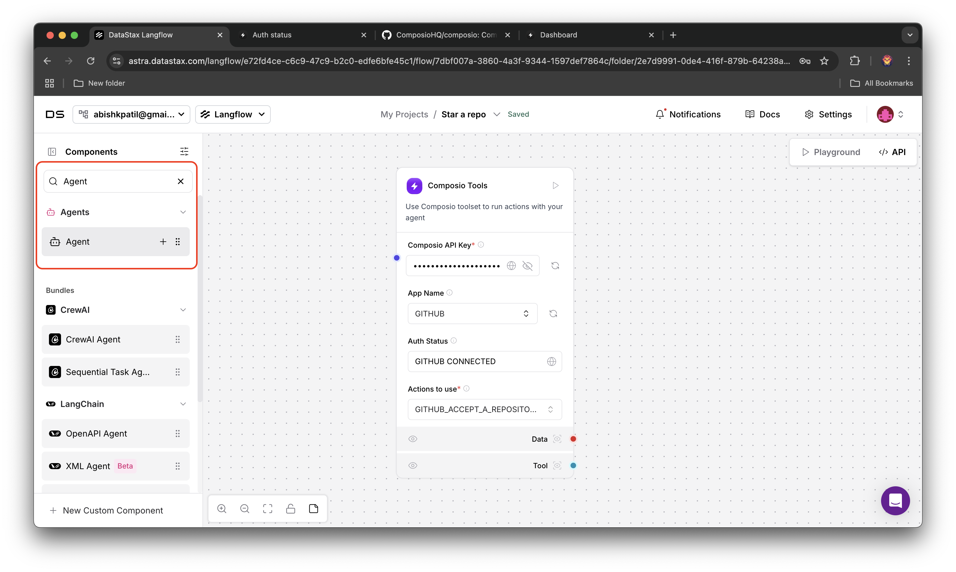In this example, we will use LangFlow to star a repository on Github using Composio Tools