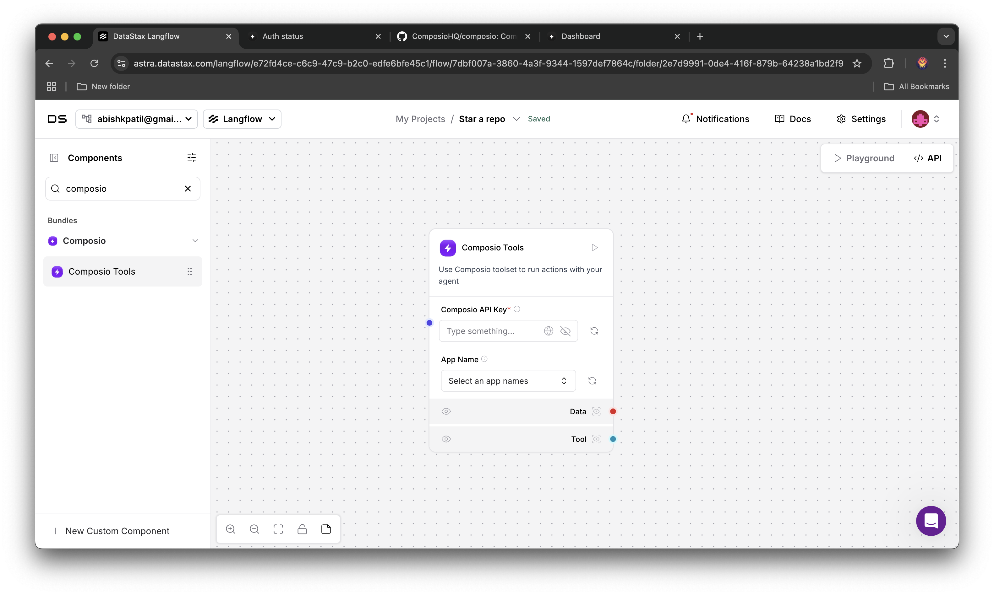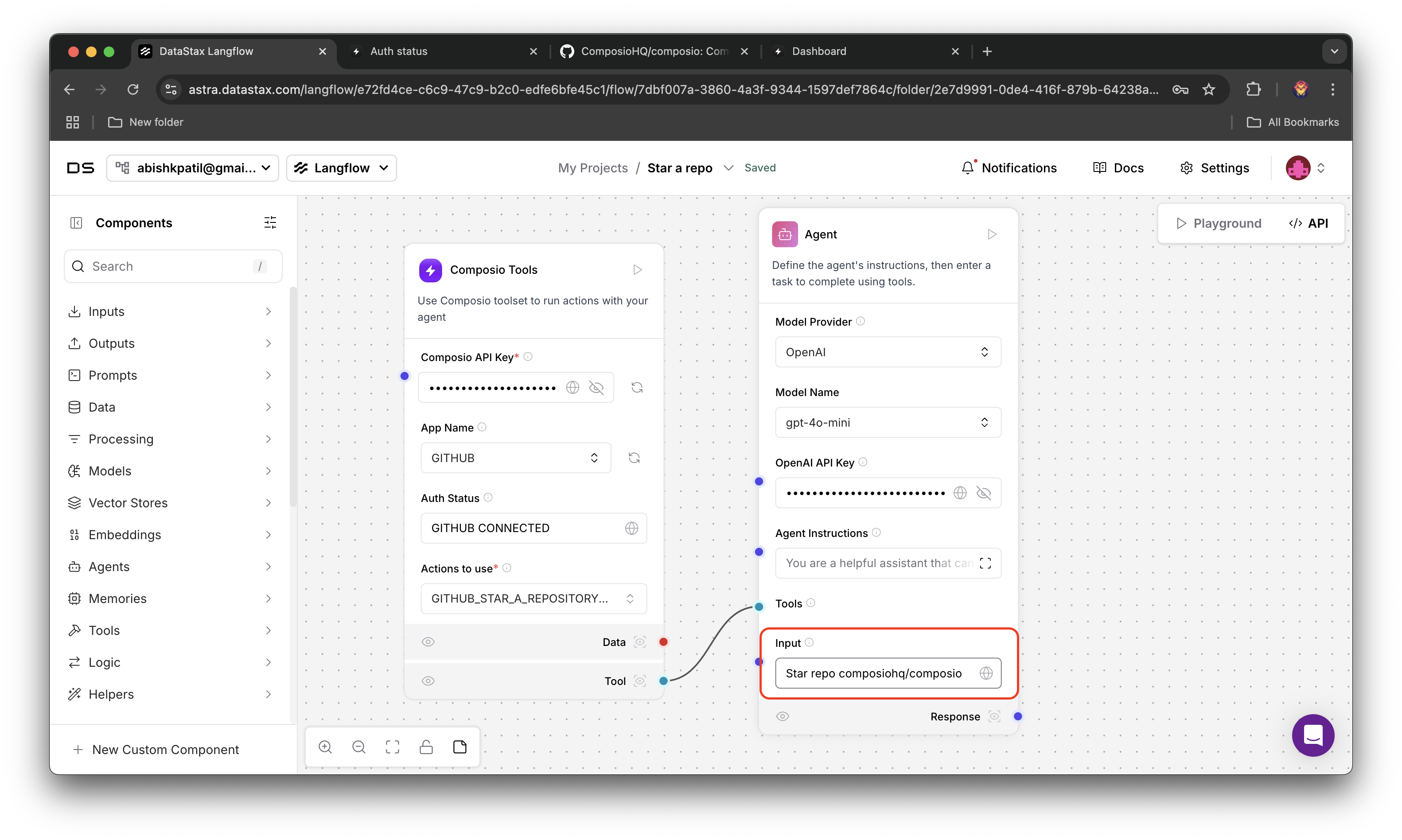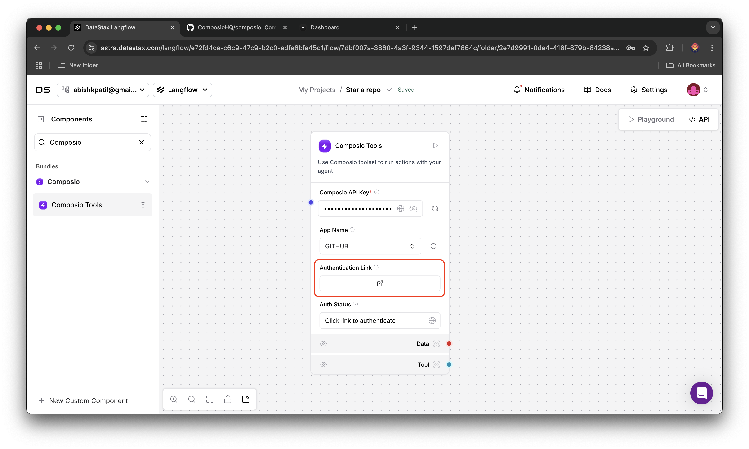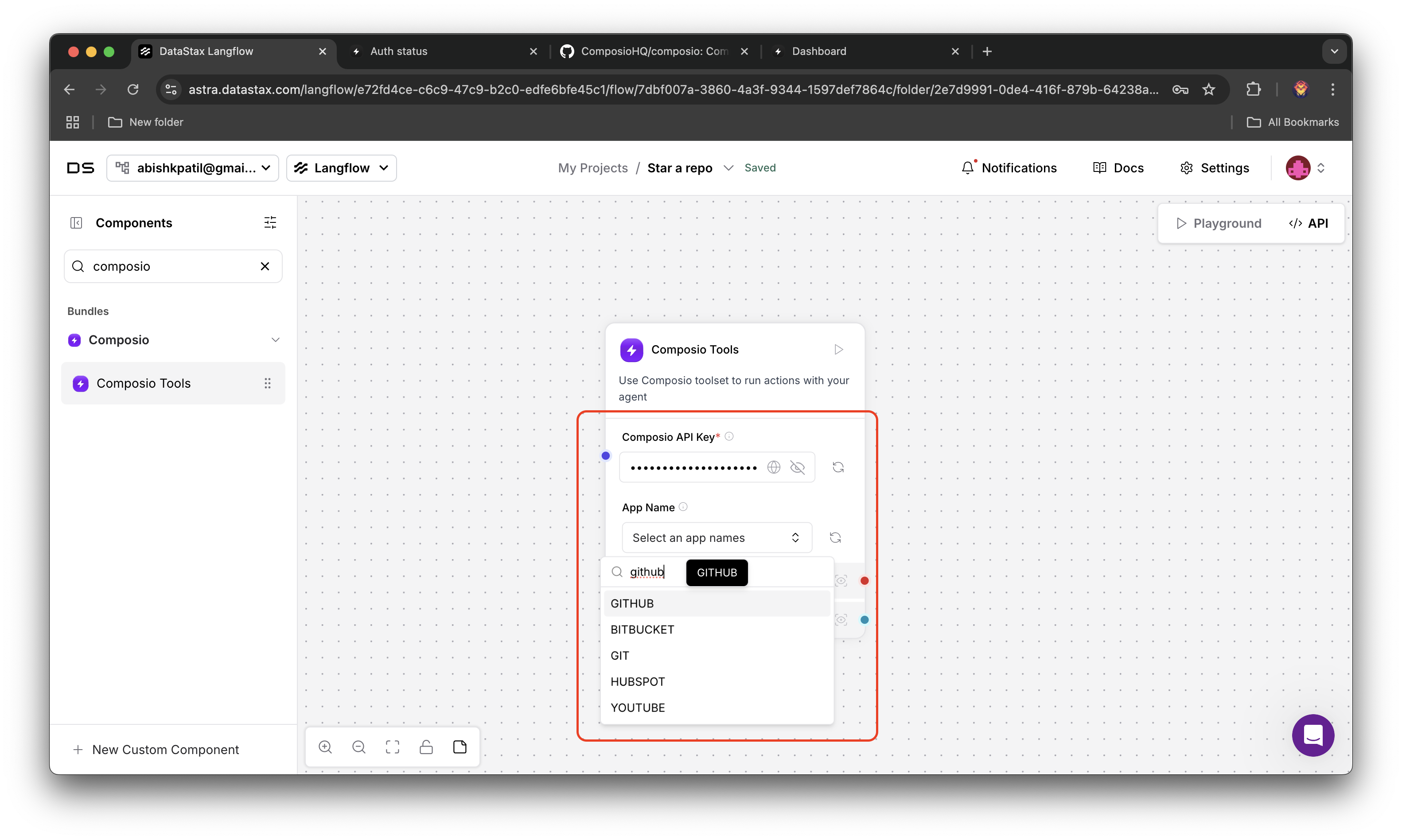 In this example, we will use LangFlow to star a repository on Github using Composio Tools