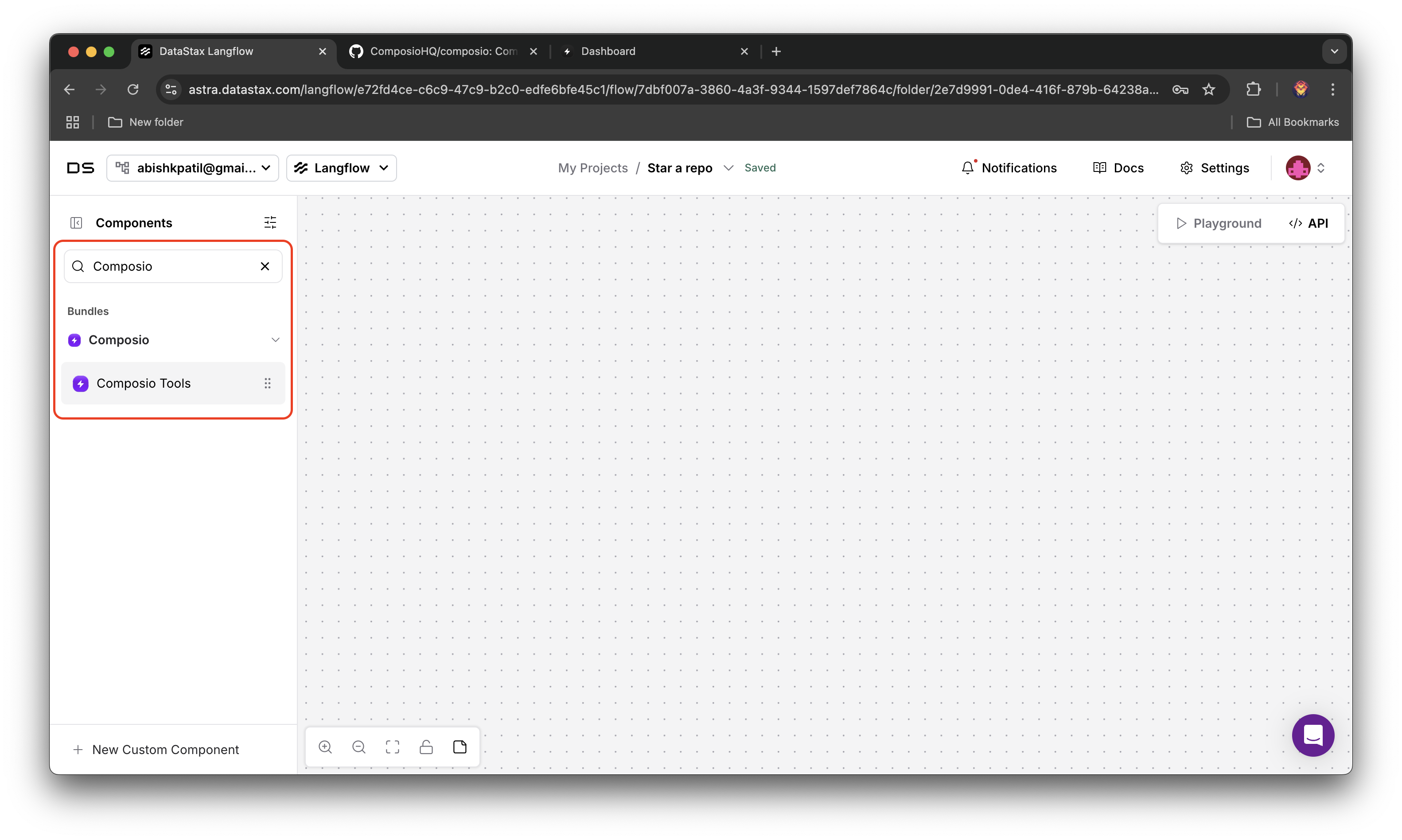 Head over to the LangFlow website, create a new project, look for Composio component in the component list and add it to your project