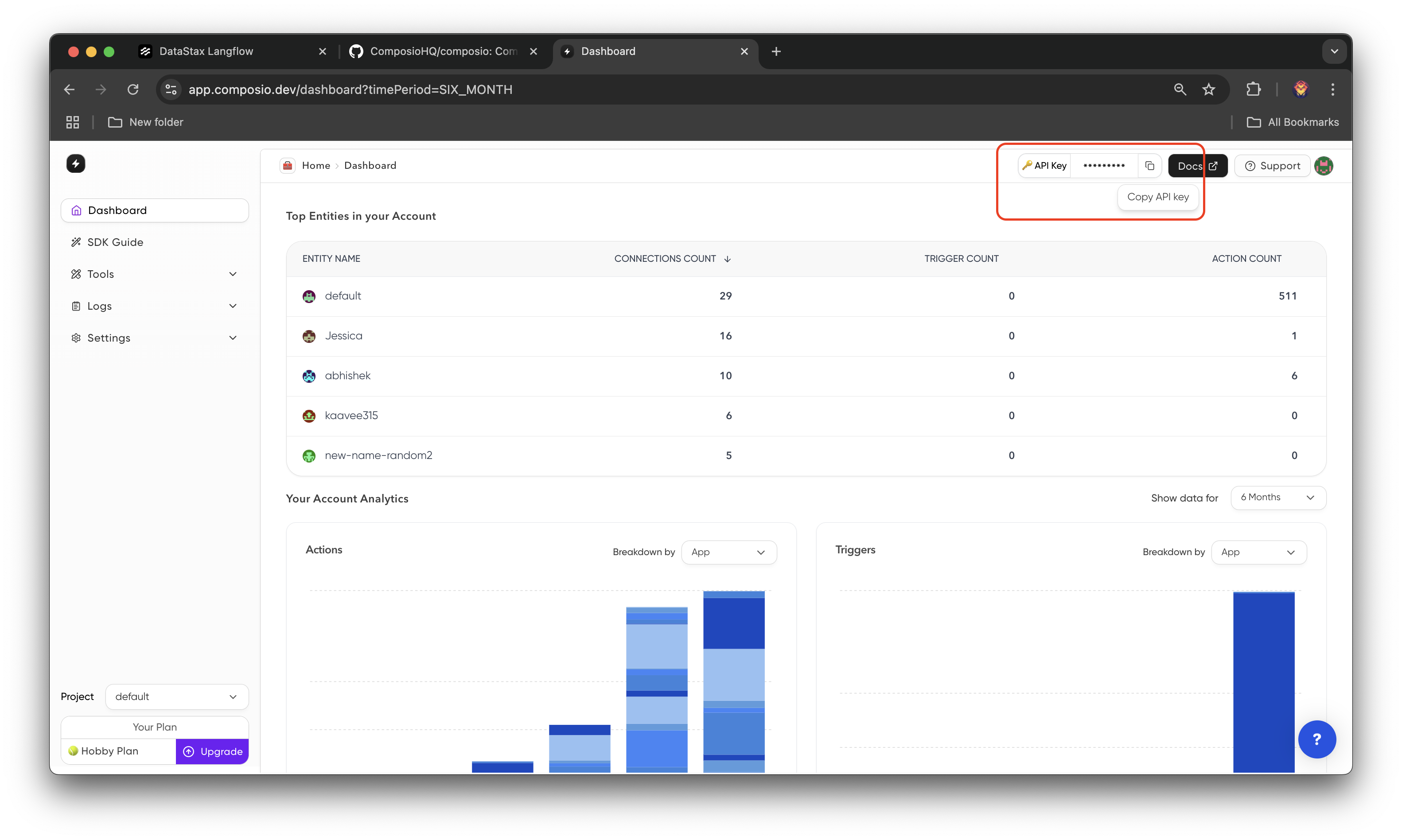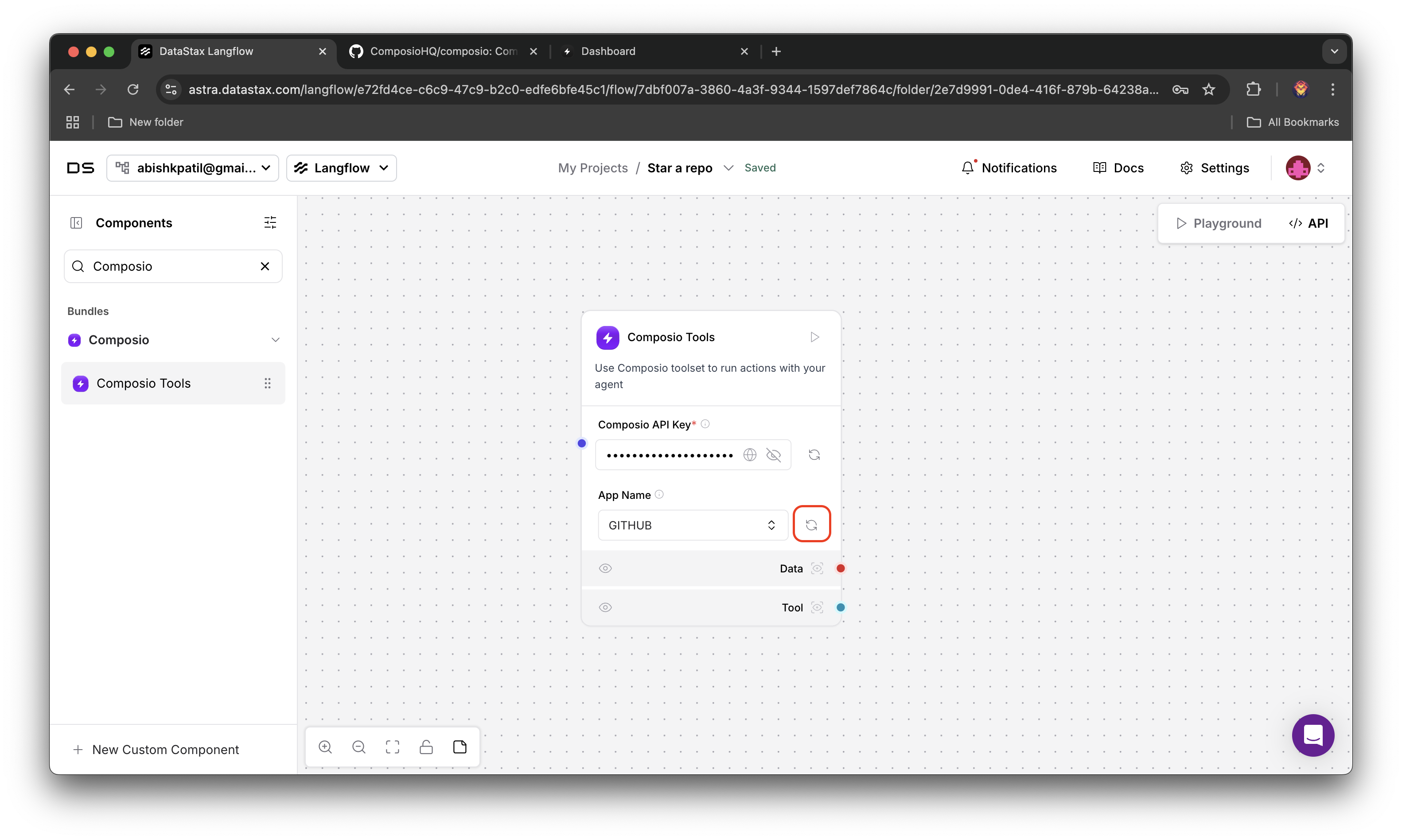 Go to your Composio Dashboard and copy your API key, paste it in the API Key field in the Composio component and then search for Github in apps list and select it