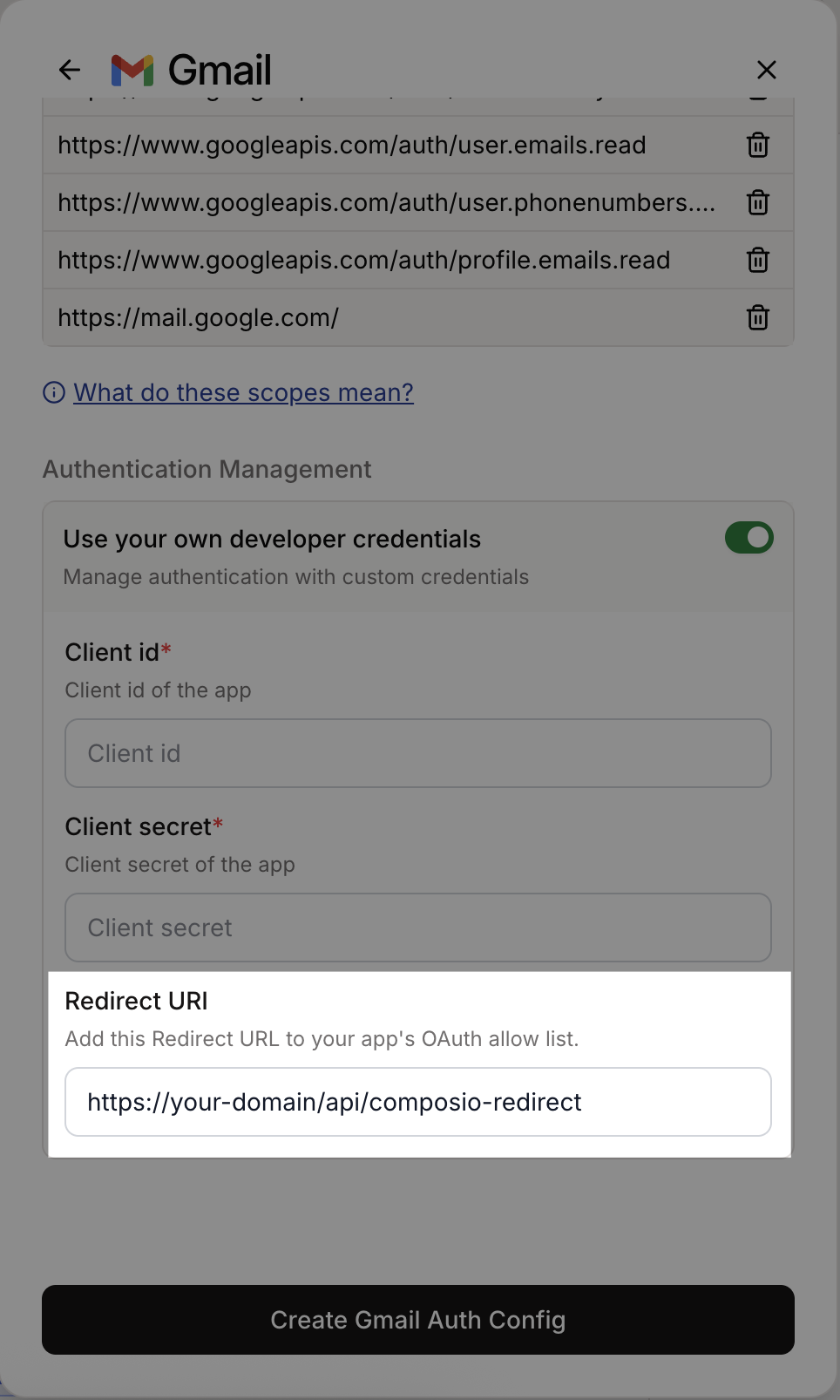 - Update your auth config in the Composio dashboard to use your custom redirect URI: