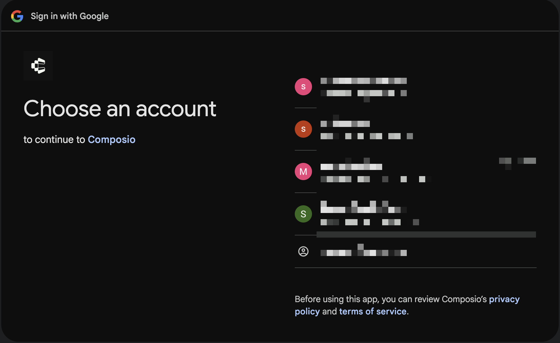 When users authenticate, they briefly see backend.composio.dev in their browser URL. Composio needs to receive the OAuth callback to capture and store the authentication tokens.